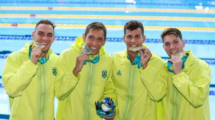 O Brasil venceu uma emocionante disputa pela medalha de ouro nos Jogos Pan-Americanos de Santiago. Na tarde de terça-feira (24), a equipe de natação formada por Murilo Sartori, Breno Correia, Fernando Scheffer e Guilherme Costa bateu o recorde da competição no revezamento 4 x 200 m livre.CONTEÚDO RELACIONADOFlavia Saraiva conquista prata inédita no Pan-AmericanoBrasil vence EUA na estreia no futebol masculino no PanEles fecharam a disputa em 7min07s53. Foi uma vantagem de pouco mais de meio segundo sobre o time dos Estados Unidos, que concluiu a prova em 7min08s06. Na virada para os 50 metros finais, o norte-americano Jack Dahlgreen tinha vantagem de 0s20 sobre Guilherme Costa, que teve força para buscar a ultrapassagem.