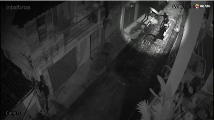 Câmeras de segurança flagraram a ação criminosa do início ao fim que durou poucos segundos. O relógio marcava quase 20h30 quando a mulher, que segurava uma bolsa, é abordada pelo falso entregador. Coagida, a vítima entrega todos os os pertences e se afasta rapidamente.