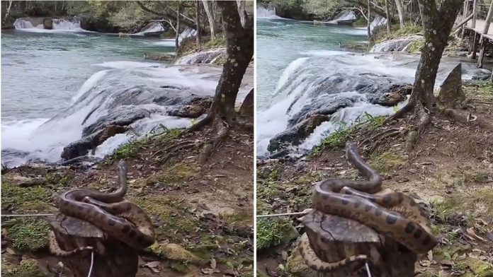 Essa semana um vídeo inusitado mostra um filhote de cobra sucuri curtindo a paisagem de uma cachoeira no Mato Grosso. Nas imagens, que viralizaram nas rede sociais, mostram a serpente em cima de um tronco de uma cerca “de boa” observando a natureza a sua volta, em especial a belíssima cachoeira.