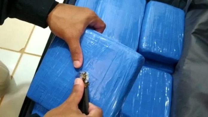Devido ao seu comportamento, bem como as respostas desencontradas, a equipe realizou buscas em sua bagagem, que mesmo por fora, já apresentava um odor característico da droga. Dentro da bagagem, foram encontrados 09 (nove) tabletes de maconha, que totalizaram 10 kg.