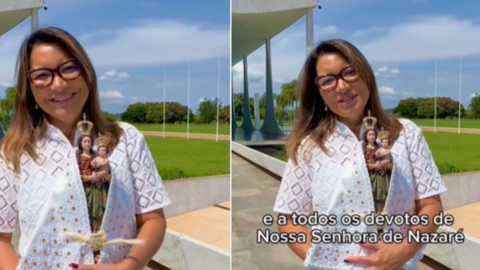 “Domingo de muitas bênçãos e muita gratidão por aqui. Como não conseguimos estar no Círio de Nazaré este ano, em Belém, hoje celebramos na Capela do Alvorada uma missa em homenagem à Nazinha. Conduzida pelo Cardeal Raymundo Damasceno Assis, a celebração foi um momento especial para agradecer por todas as graças alcançadas no último ano e pela plena recuperação do meu marido e nosso presidente Lula. Muito obrigada ao Cardeal Damasceno por celebrar conosco este momento. Que sigamos sempre protegidas e protegidos pelo manto sagrado de Nossa Senhora de Nazaré”, postou Janja nas redes sociais de Lula.