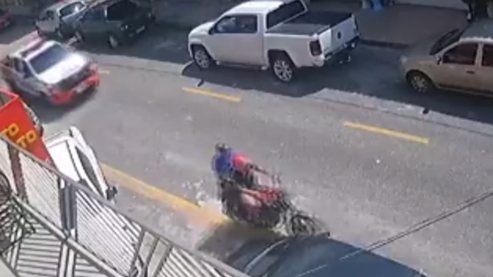 A Polícia Militar frustrou a ação de dois criminosos nesta quinta-feira (19) no bairro do Maracangalha, em Belém. Imagens de câmeras de segurança registraram o momento em que os suspeitos sobem em uma moto e tentam fugir da PM.No vídeo é possível identificar um homem de camisa preta e capacete vermelho, ele é o piloto da moto e leva na garupa um segundo homem, seu parceiro nos crimes. De acordo com a Polícia, os dois realizaram diversos roubos no bairro.CONTEÚDOS RELACIONADOS:Intervenção termina com um morto e drogas apreendidasVídeo: Dupla em moto tenta roubar homem na MarambaiaA guarnição do 1º Batalhão avistou os dois bandidos e ordenou que parassem. No entanto, os dois empreenderam fuga na foto. Houve confronto entre policiais e bandidos e um dos suspeitos acabou sendo alvejado com disparos de arma de fogo. Ele chegou a ser socorrido para a UPA da Sacramenta, mas morreu no local. Quer mais notícias sobre polícia? Acesse o nosso canal no WhatsAppO outro suspeito foi apresentado, juntamente com três cordões de ouro, uma quantia em dinheiro e outros objetos das vítimas, na Delegacia de Polícia Civil da Sacramenta.Confira abaixo o vídeo que mostra a ação da PM na perseguição dos dois criminosos.