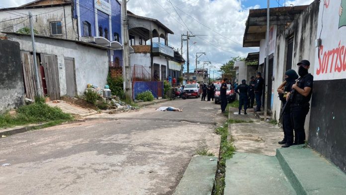 A manhã deste domingo (18) foram de medo e violência para moradores do bairro da Pratinha I, em Belém. Ainda nas primeiras horas do dia, disparos de arma de fogo levaram embora a paz na vizinhança e a vida de um homem.Flávio Adriano Moraes Pinheiro, de 28 anos, foi executado a tiros próximo ao estabelecimento Zinho's Bar, localizado na passagem Samaúma, nas imediações da rua John Engelhard. De acordo com as informações preliminares sobre a ocorrência, ele teria sido alvejado por, ao menos, 10 disparos.Veja também:Vídeo: homem entra em farmácia, ameaça e rouba atendenteCriminosos invadem casa e roubam família em AnanindeuaMoradores do entorno da cena do crime afirmam que ouviram os tiros e, em seguida, ao saírem para a rua, localizaram o corpo da vítima no chão.Outras testemunhas informaram que o homem saía de uma festa no bar quando foi abordado por quatro suspeitos em um veículo, que desceram e atiraram em direção à vítima.Guarnições da Polícia Militar foram acionadas para atender o caso. A Polícia Científica do Pará também esteve presente no local para realizar os primeiros levantamentos e proceder com a remoção do corpo.