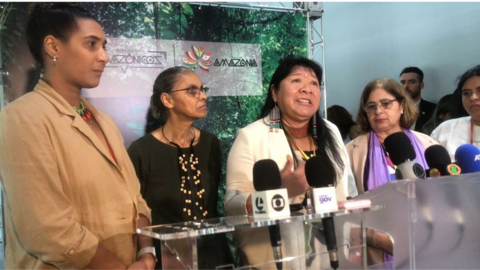 O segundo dia dos Diálogos Amazônicos, realizado no Hangar, em Belém (PA), retomou sua programação na manhã deste sábado (5), com os eventos auto-organizados, além da primeira plenária-síntese do dia.Na ocasião, após atender à agenda do “MMulheres”, as ministras Marina Silva (Meio Ambiente), Anielle Franco (Igualdade Racial), Cida Gonçalves (Mulheres) e a presidente da Funai, Joênia Wapichana, concederam uma entrevista para a imprensa e comentaram políticas e ações afirmativas para a proteção da mulher, em especial a mulher indígena.+ Diálogos Amazônicos: veja a programação para este sábado (5)