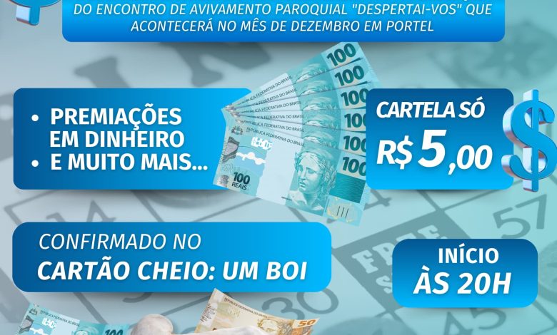 As cartelas estarão à venda por apenas R$ 5,00 e o valor arrecadado será destinado para a realização do encontro de avivamento paroquial “Despertai-vos”, marcado para o mês de dezembro, também em Portel.