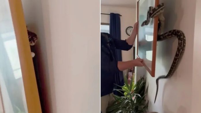 Imagina abrir a porta de casa e dar de cara com uma cobra atrás dela. Seria assustador, não é? Para aqueles que têm um pavor profundo de serpentes, essa situação seria de tirar o fôlego. O coração dispararia de medo, enquanto a mente lutaria para processar o que estava acontecendo.Cobra de duas cabeças nasce em petshop na InglaterraAnjo ou demônio? Cabra anda apenas em duas patas; assista!Moradores de Sunshine Coast (Queensland, Austrália) passaram por essa situação inusitada no último sábado (19). Tudo começou quando eles ouviram um barulho estranho na parede e decidiram investigar. Para a surpresa e o terror dos moradores havia uma cobra píton-tapete escondida atrás do quadro na sala de estar.Veja o vídeo: