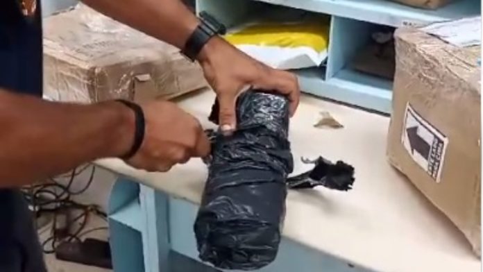 O trabalho das instituições segue firme nas ações contra crimes envolvendo drogas ilegais no Pará.A Polícia Federal, em ação conjunta com a Receita Federal, prendeu em flagrante um homem que receberia quase um quilo de maconha, na última sexta-feira (18). A encomenda veio de São Paulo pelos Correios, com destino ao distrito de Vila dos Cabanos, em Barcarena, no Pará. Veja também:Ladrão é preso pela Polícia Federal no aeroporto de Belém Polícia Federal intercepta 290KG da ‘supermaconha’ O flagrante ocorreu a partir da ação do cão farejador da Receita Federal, que indicou a possibilidade de haver substância ilícita dentro do pacote. Equipes da Delegacia de Repressão a Entorpecentes (DRE) e da Delegacia de Repressão a Crimes contra o Patrimônio e ao Tráfico de Armas (DELEPAT) da Polícia Federal, foram à agencia em Vila dos Cabanos, onde abordaram a esposa do destinatário, que havia ido ao local retirar a encomenda.Confirmada a presença de 910 gramas de maconha no pacote, a mulher do destinatário foi questionada sobre onde ele poderia ser encontrado. Ela apontou o endereço de trabalho, onde a equipe policial fez a prisão em flagrante do suspeito. Junto à esposa, o preso foi conduzido à Superintendência Regional da Polícia Federal para a lavratura do Auto de Prisão em Flagrante. Após ouvir os envolvidos, o delegado confirmou a prisão do homem. No sábado (19), a Justiça homologou a prisão em flagrante e a converteu em preventiva.Veja o vídeo: